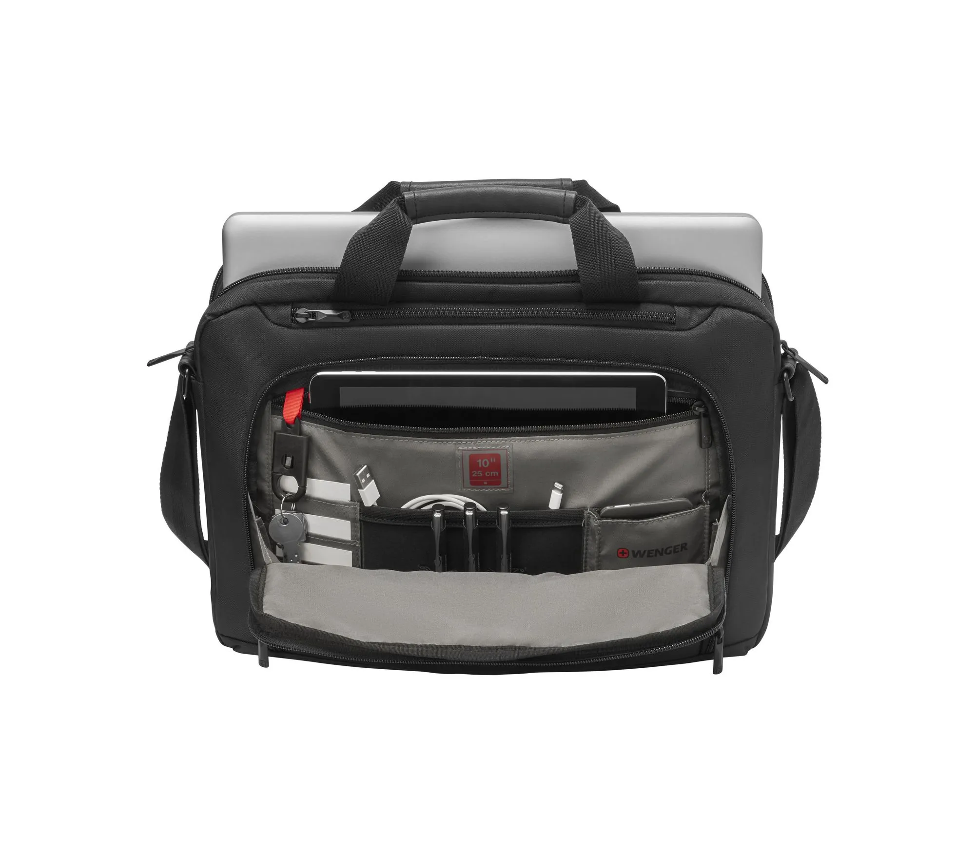 Solid PC veske med mange smarte detaljer. Sort nylon med bærehåndtak og skulderreim.