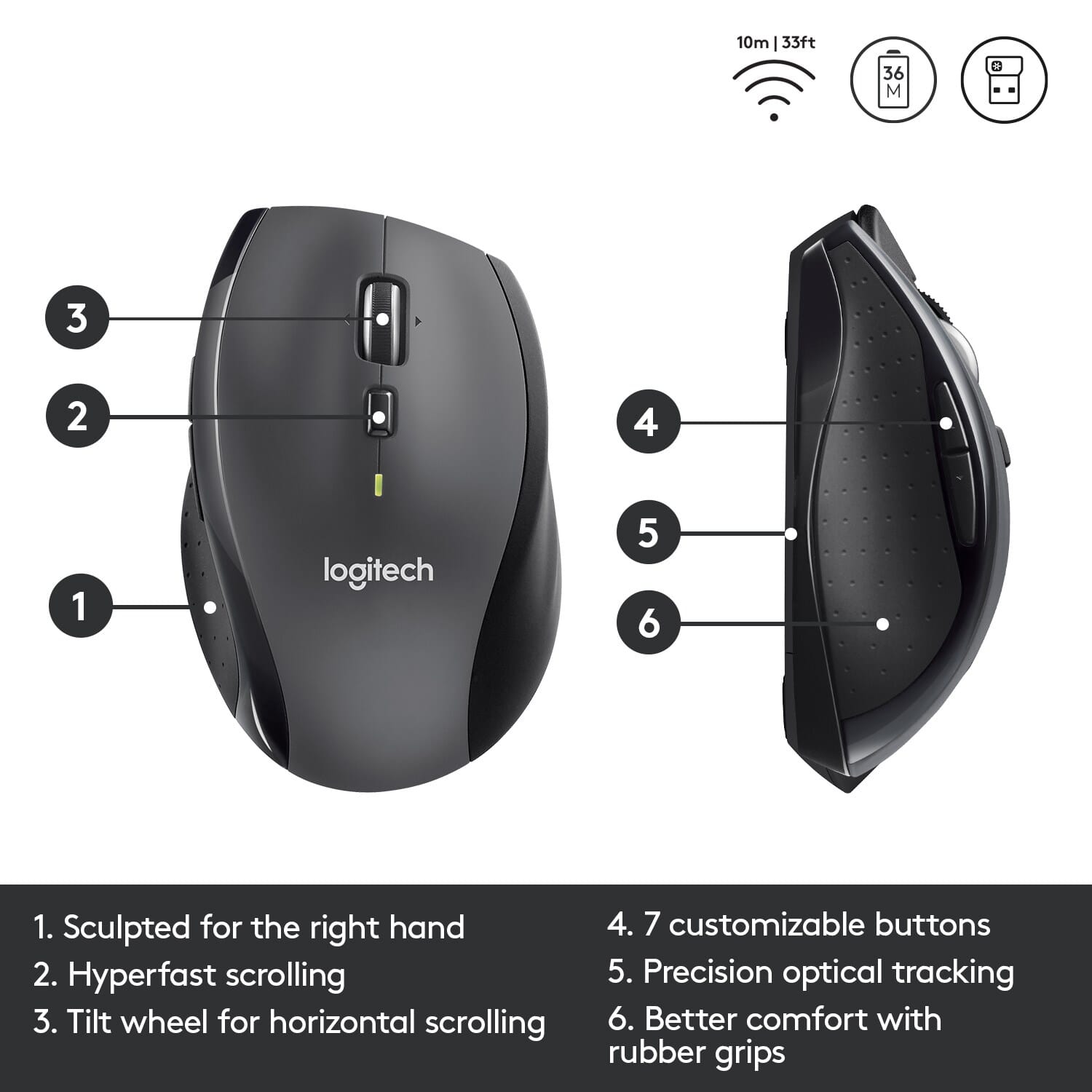 Ikke nødvendig å bytte batteri på nesten 3 år med Logitech® Wireless Mouse M705, noe som betyr at du får lengre tid til å gjøre mer. Den ergonomiske og behagelige høyre museknappen er buet for bedre håndposisjon, og det nesten friksjonsløse rullehjulet gjør at du enkelt og raskt kan bla gjennom dokumenter og nettsider med en enkel rullebevegelse. Logitech® trådløs mottaker forblir i datamaskinen, så det er ikke nødvendig å koble den til når du flytter, noe som eliminerer risikoen for å miste den. Du kan også legge til andre kompatible trådløse enheter til samme mottaker. Du kan være trygg på at du alltid vil ha jevn, nøyaktig markørkontroll på overflater som normalt ville avbryte optisk overføring fra mus.