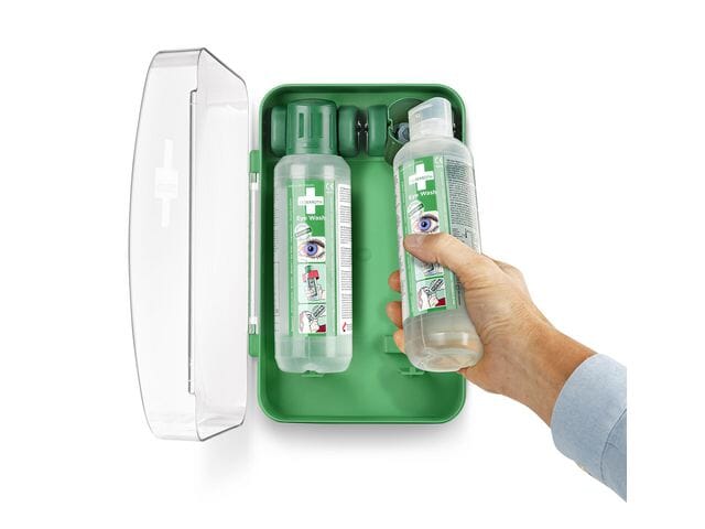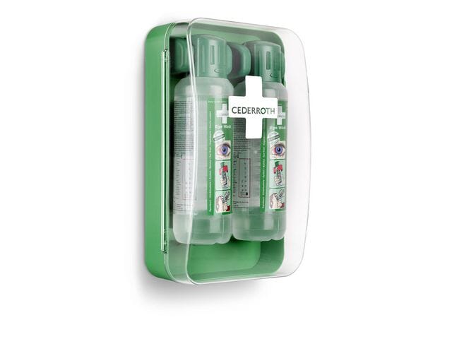 Inkluderer 2 flasker Cederroth Øyedusj. Lett å få plass til også i mindre rom. Transparent lokk for høy synlighet. Flaskene åpnes automatisk når de vris ut av holderne, og skylling kan starte øyeblikkelig.
