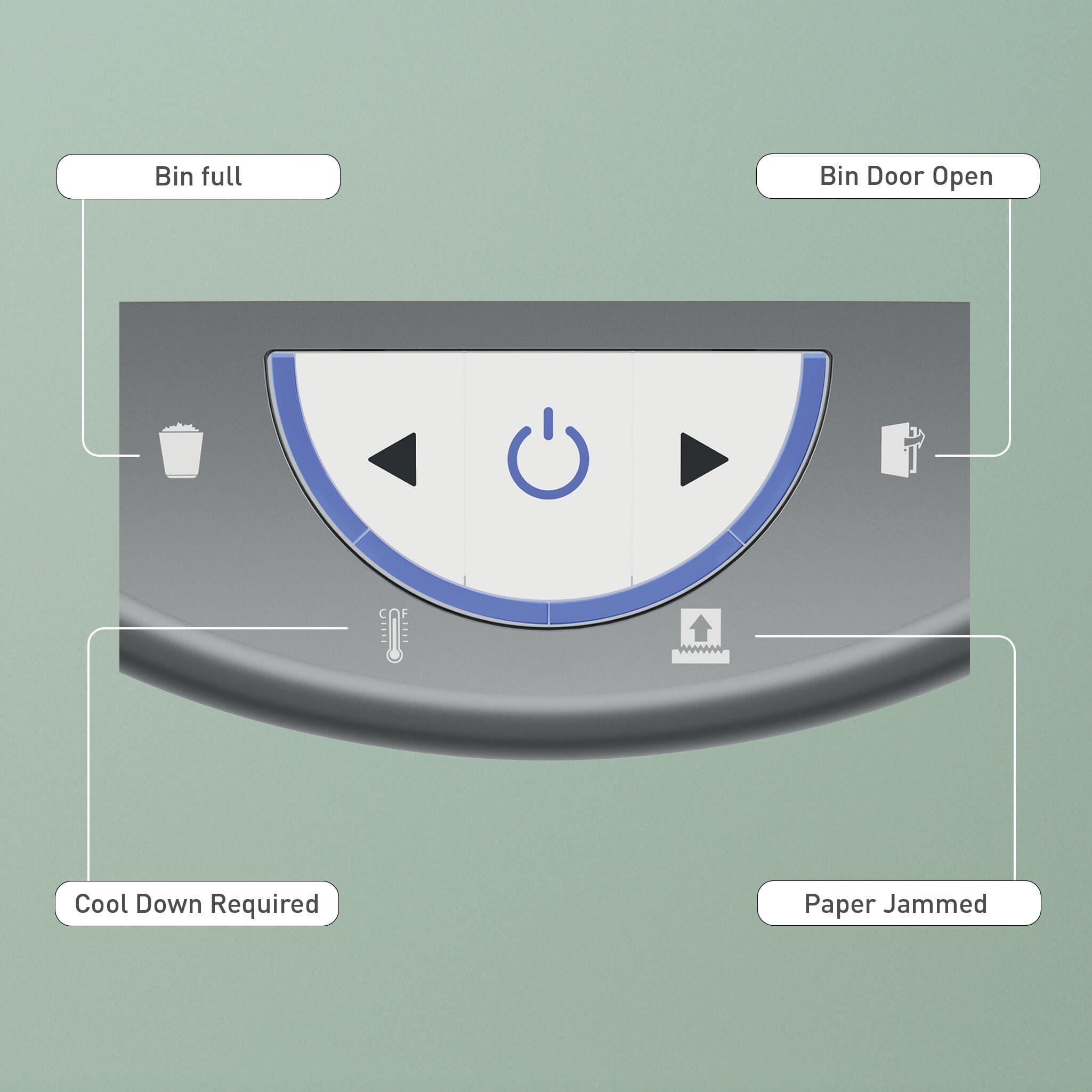 • Intuitivt LED-display med varselindikasjoner for full beholder, åpen dør, overoppheting og overbelastning.