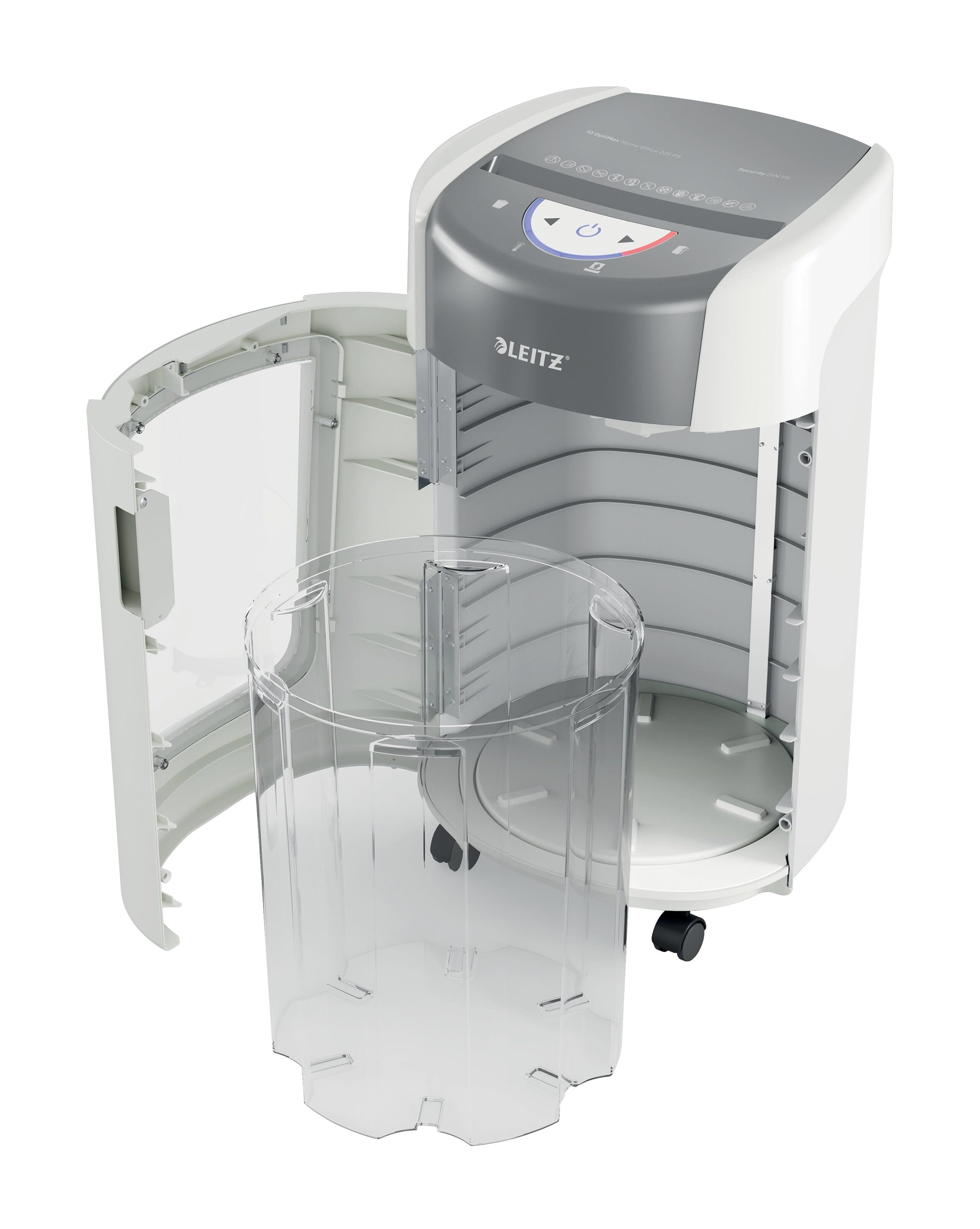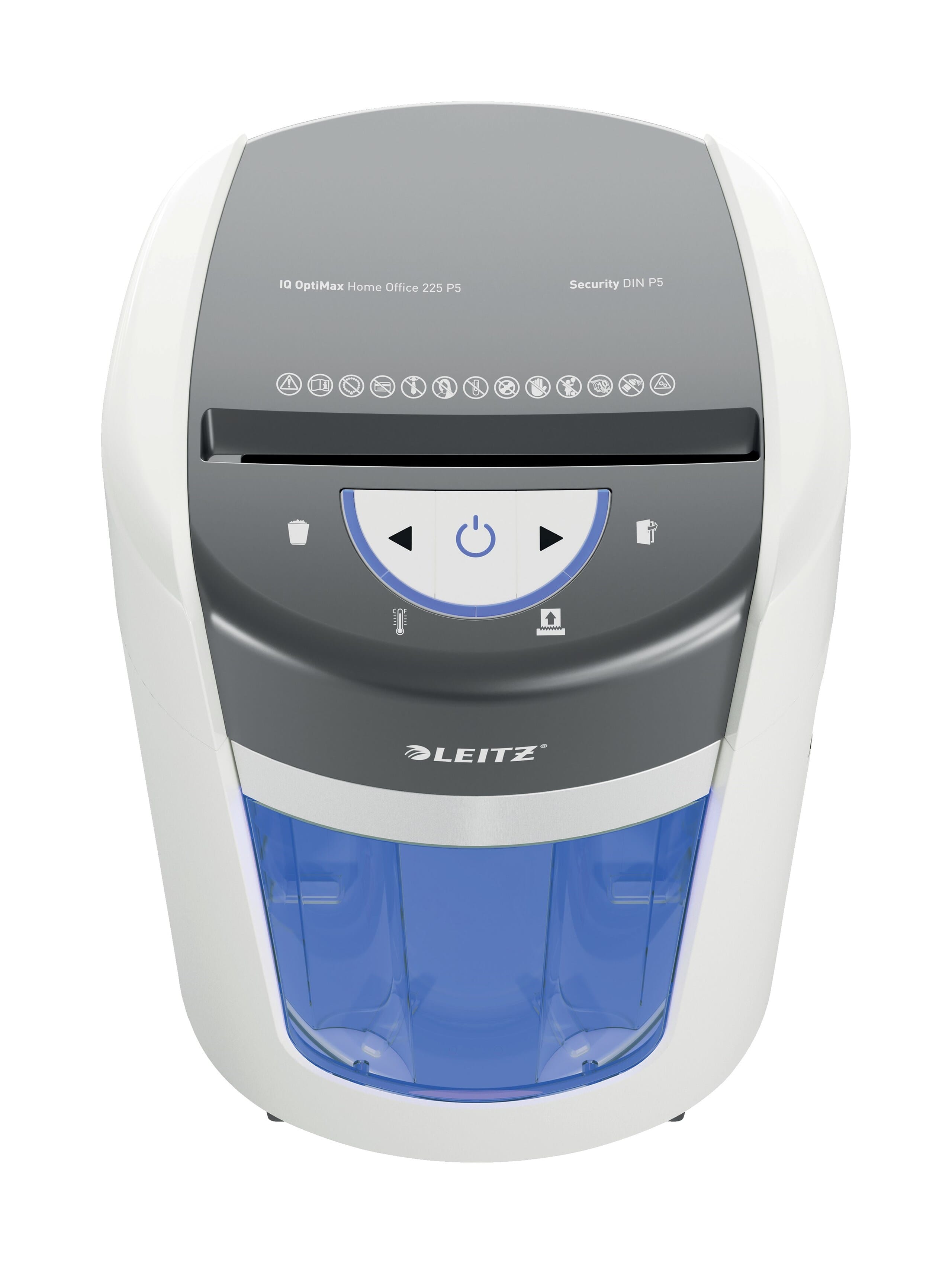 • . Den roterende beholderen sikrer flat og jevn papirfordeling, hindrer papirbitene fra å danne en topp i beholderen, slik at ytterligere 70 A4-ark kan makuleres før den må tømmes. BRT betyr at det ikke er nødvendig å fjerne eller riste beholderen: indikatoren "full beholder" aktiveres bare når den når 100 % av sin kapasitet. Den sjenerøse 15L beholderen rommer opptil 225 makulerte A4-ark, og lyser blått under bruk. Det intuitive LED-displayet inkluderer røde varselsindikasjoner som for eksempel beholderen er full (og må tømmes) og døren på maskinen er åpen. Leitz IQ OptiMax 225 er allsidig og passer ethvert arbeidsmiljø på grunn av sin ultra-stille drift, elegante design og imponerende holdbarhet. Kontinuerlig driftstid på 20 minutter.