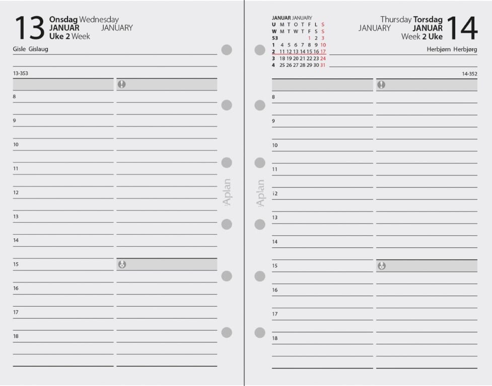 Praktisk års-sett for din Aplan perm.Unihulling gjør at det passer i de fleste permer, også Filofax samt Grieg, Alle papirbaserte Aplan produkter er miljøsertifisert etter anerkjente internasjonale standarder slik at de minst mulig påvirker vårt felles ytre miljø. Sidestørrelse: 8,2 x 12,8 cm Hullet for Aplan 70 gr papir En dag pr. side Norsk Klokkeslett fra-til: 08:00-18:00 2 farger sort og rød i kalender Årsoversikt innværende og neste år Månedoversikt inneværende og neste år Notatsider 16 siders atlas Norske navnedager Norske helligdager