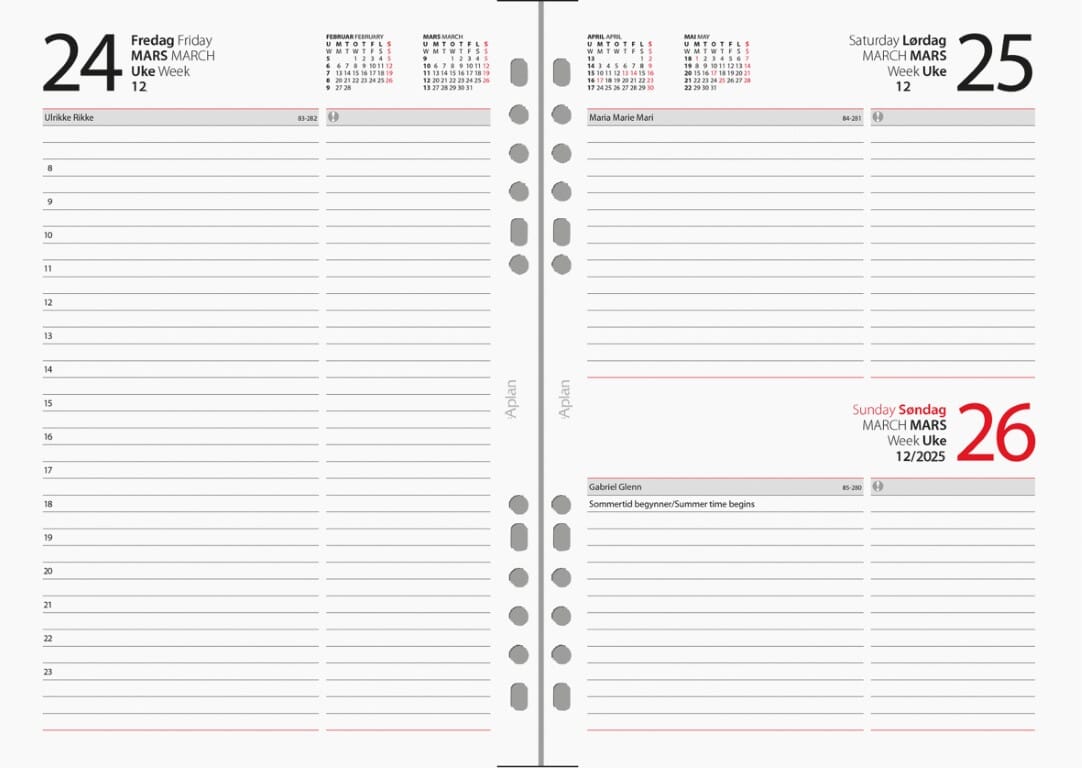 Praktisk års-sett for din Aplan perm.Unihulling gjør at det passer i de fleste permer, også Filofax samt Grieg, Alle papirbaserte Aplan produkter er miljøsertifisert etter anerkjente internasjonale standarder slik at de minst mulig påvirker vårt felles ytre miljø. Sidestørrelse: 14,8 x 21 cm Hullet for Aplan 70 gr papir En dag pr. side Norsk Klokkeslett fra-til: 08:00-23:00 2 farger sort og rød i kalender Årsoversikt innværende og neste år Månedoversikt inneværende og neste år Notatsider 16 siders atlas Norske navnedager Norske helligdager