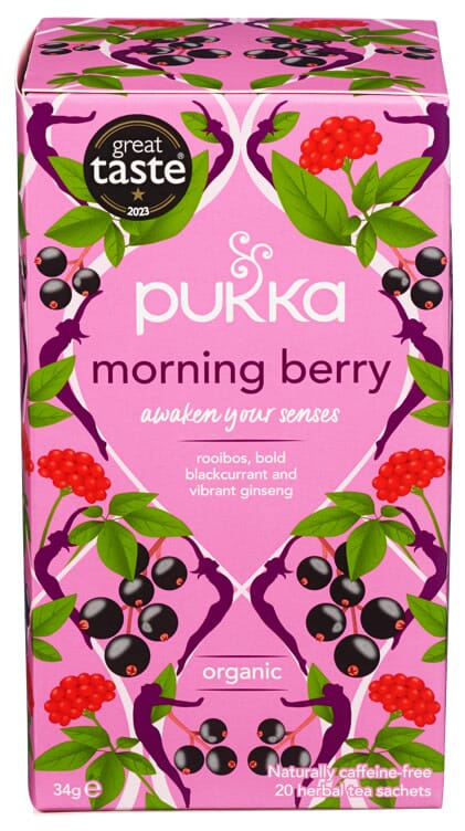 En nydelig urtete for å komme i gang med dagen bestående av søte solbær og saftige bjørnebær blandet med hibiskus, roiibos, rosmarin og ginseng.