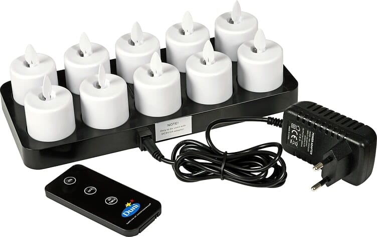 LED-sett med bevegelig flimrende flamme for et stearinlysaktig utseende. Varmt hvitt lys. 25 brennende timer, 6-8 timer ladetid, 500 sykluser total levetid. Pakken inneholder 10stk LED lys, fjernkontroll og ladestasjon. Kun til innendørs bruk.