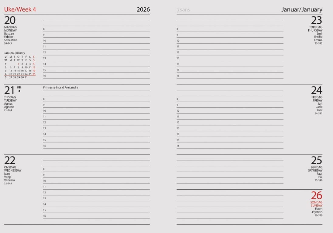 7.sans Datum er den kalender som flest personer ønsker å bruke. Gjør dine personlige notater hver dag. En lommekalender med en uke på to sider gir deg masse plass hver dag. Samtidig er den kompakt å ha med seg. Kan velges som spiralisert eller fast innbundet. Flere varianter med ulike utrykk skulle gi en variant for de fleste. Inneholder mye informasjon, samt atlas. Alle 7.sans produkter er miljøsertifisert etter anerkjente internasjonale standarder slik at de minst mulig påvirker vårt felles ytre miljø. Sidestørrelse: 8,7 x 15,3 cm Hjørneperforering 60 gr papir En uke på to sider Norsk Klokkeslett fra-til: 08:00-16:00 Røde søndager og helligdager Årsoversikt innværende og neste år Månedoversikt inneværende og neste år Notatsider og infosider 16 sider atlas Norske navnedager Norske helligdager