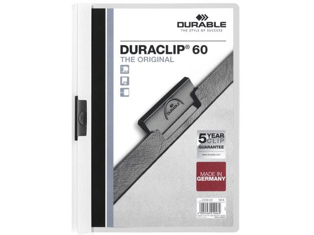 Organiser papirer for skole eller jobb i denne Durable Duraclip-klemmappen som rommer opptil 60 ark på en trygg måte.