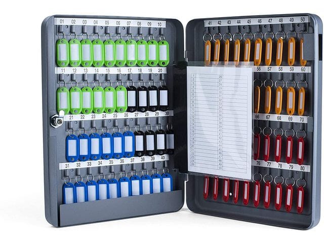 Nøkkelskap PAVO plass til 80 nøkler leveres med nøkkelbrikker, selvklebende tall, etikettbord og veggfester.