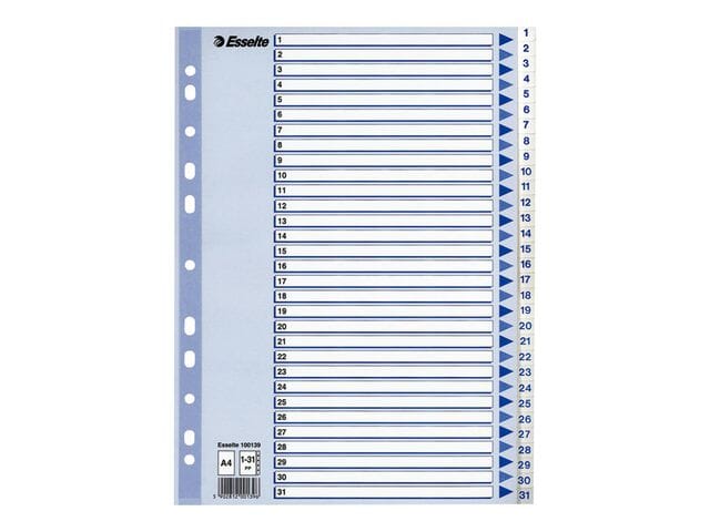 Esselte®-skillearkene er en ideell løsning for å administrere dine dokumenter og ringpermer. Skillearkene leveres forhåndstrykte for enkel merking og identifisering av ditt personlige eller arbeidsrelaterte innhold. Skillearkene er enkle å skrive på og passer også inn i alle ringpermer eller mapper ved å lage hull på sidene.