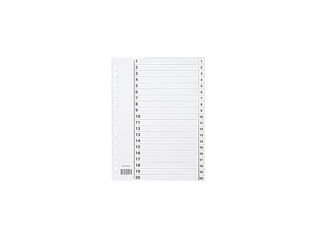 Forhåndstrykte skilleark, merket 1–20Slitesterk konstruksjon som tåler bruk og slitasjeUniverselle perforeringer gjør at de kan brukes med flere ringpermer og arkiveringssystemerMateriale: plastStørrelse: A4Farge: Hvit