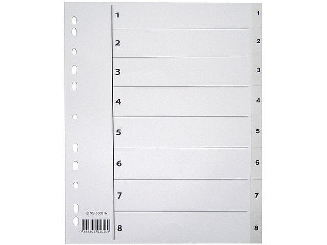 Laget av polypropylenDelt inn i 8 delerKompatibel med papir av A4-formatSkillearktitler med tallFarge: Hvit