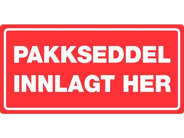 Rød varseletikett med hvit tekst med informasjon om at pakkseddel ligger i forpakningen