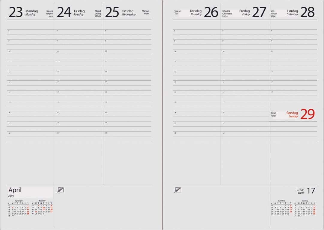 7.sans Novum er en av vår bestselgere hva gjelder avtalebøker. Av mange og kalt sjefskalender. Stående kolonner i kalendariet ser ut til å være en favoritt. Formatet gir deg god notatplass. Slank utførelse gjør den enkel å ha med. Finnes i mange varianter hva gjelder innbinding og design. De fleste finner raskt sin favoritt. Novum er godt egnet for profilering av din egen virksomhet. Enkle trykkemetoder gjør det enkelt å lage den veldig personlig. Alle 7.sans produkter er miljøsertifisert etter anerkjente internasjonale standarder slik at de minst mulig påvirker vårt felles ytre miljø. Sidestørrelse: 19 x 27 cm 70 gr papir En uke på to sider Norsk Klokkeslett fra-til: 08:00-18:00 Røde søndager og helligdager Hjørneperforering Årsoversikt innværende og neste år Månedoversikt inneværende og neste år Notatsider Norske navnedager Norske helligdager