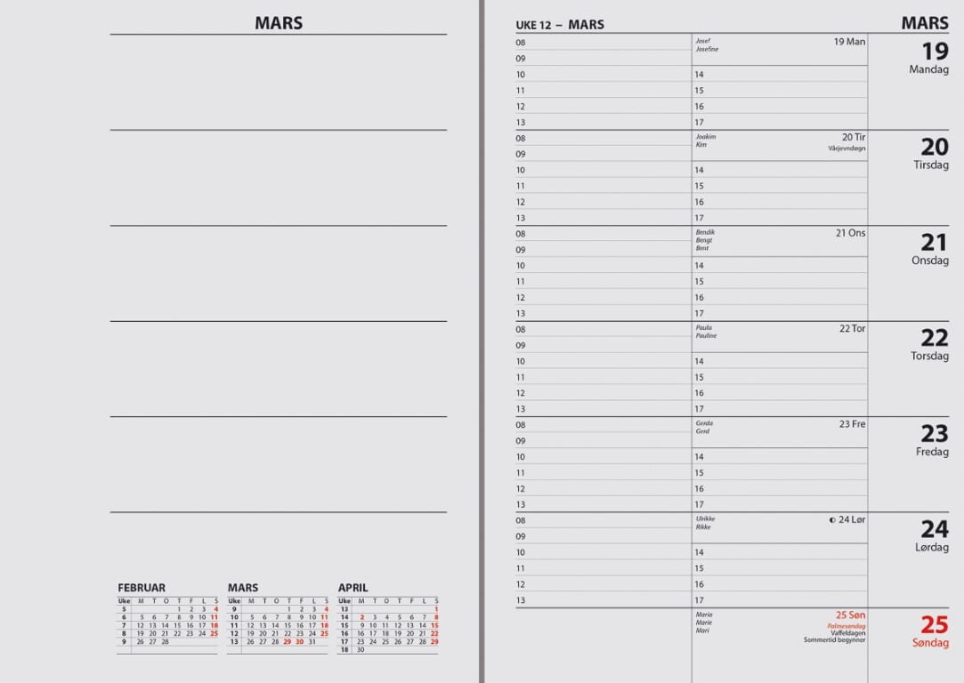 7.sans Ukekalender er en hendig fleksibel ukekalender i A5 format. På høyre side hver uke har du god notatplass for hele uken. Hver uke perforert for avrivning for optimal oversikt. Gjør den fleksibel både for avtaler og notater. Enkel å ha med overalt. Alle 7.sans produkter er miljøsertifisert etter anerkjente internasjonale standarder slik at de minst mulig påvirker vårt felles ytre miljø. Sidestørrelse: 14,8 x 21 cm A5 70 gr papir En uke på to sider Norsk Klokkeslett fra-til: 08:00-17:00 Røde søndager og helligdager Årsoversikt innværende og neste år Månedoversikt inneværende og neste år Notatsider Norske navnedager Norske helligdager