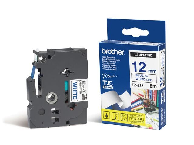 Denne laminerte Brother TZe-335-tapen er velegnet for daglig bruk med en rekke Brother P-Touch-etikettskrivere. Lager hvite etiketter med blått trykk.