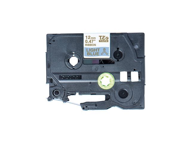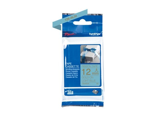 Silkebånd BROTHER TZERL34 i gull på lyseblått i 12 mm bredde som gir deg et raskt og pålitelig resultat, samt en tydelig og profesjonell utskriftsstandard