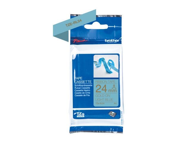Silkebånd BROTHER TZERL54 i gull på lyseblått i 24 mm bredde som gir deg et raskt og pålitelig resultat, samt en tydelig og profesjonell utskriftsstandard