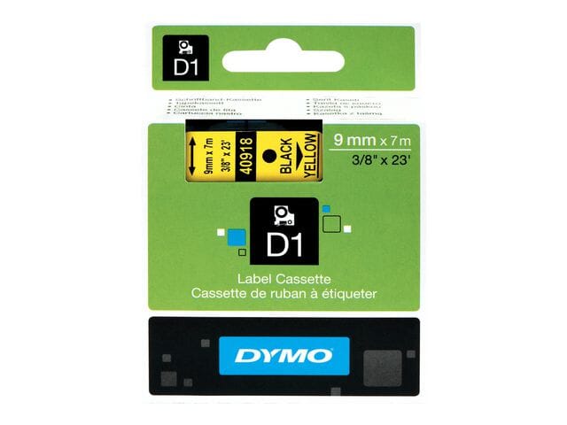 DYMO® D1-etikettkassetten på 9 mm gir stilige, tilpassede etiketter i svart og gult. Velegnet både for innendørs og utendørs bruk. D1-teipene viser tekst som skrives ut ved hjelp av varmeoverføringsteknologi, noe som fjerner behovet for blekk og toner. Hver etikett er slitesterk og varig siden de er vannbestandige, UV-bestandige og temperaturbestandige mellom –18 grader og 90 grader. De kleber på nesten alle jevne og rene overflater, inkludert plast, papir, metall, tre og glass. Den selvklebende polyesterteipen kan også fjernes for korttidsmerking uten å legge igjen limrester.