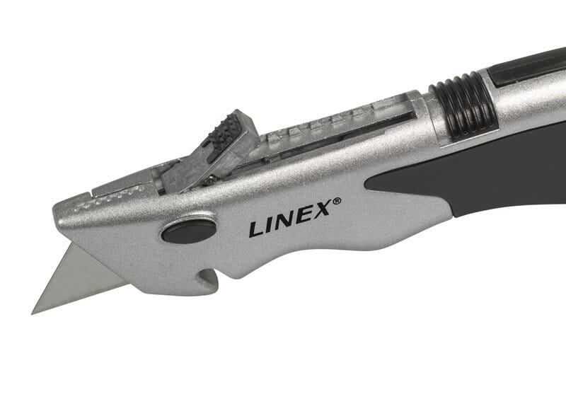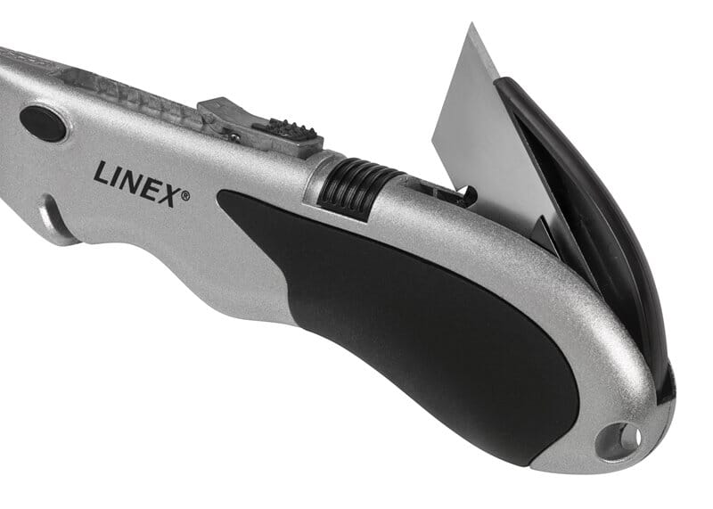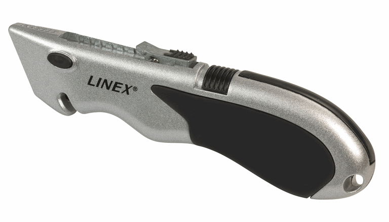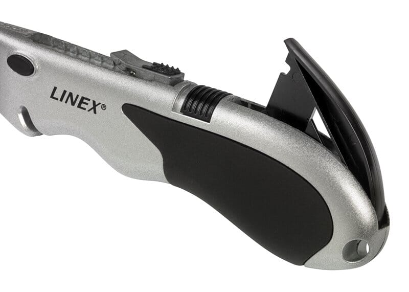 Automatisk säkerhetskniv med zinklegering. Bekväm ergonomisk design. Levereras med 1 blad, påfyllning med 5 st finns. Kammare för förvaring av extrablad på kniven. Kan öppna enstaka delar utan att öppna kniven.