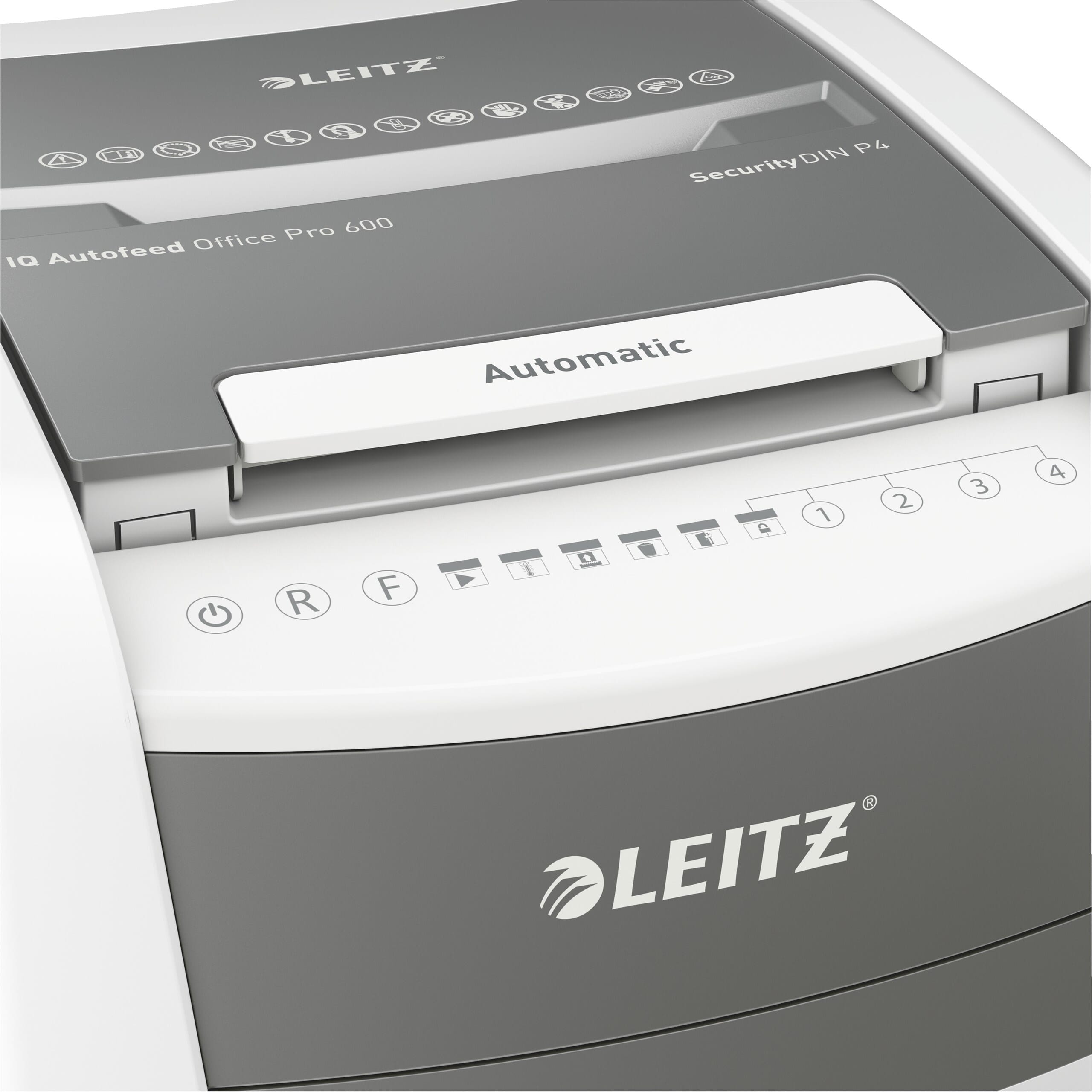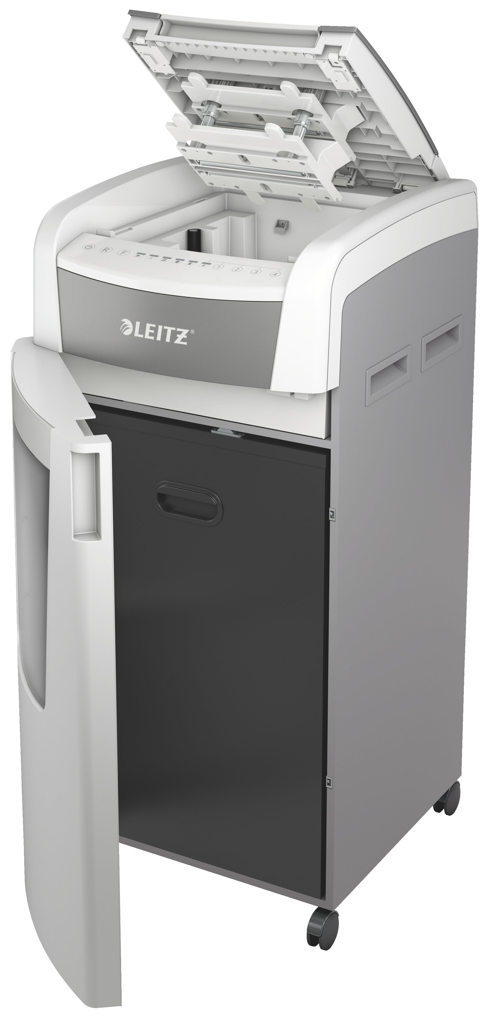 Helautomatisk makuleringsmaskin fra Leitz med unik, ren tømming av beholderen. Så intelligent at den fungerer stille på egen hånd, bare legg i bunken med papirer (inkl. stifter og binders), lukk lokket og fortsett med andre oppgaver. Ideell for bruk på kontoret. Konfidensiell sikkerhet og utmerket ytelse med denne stille makuleringsmaskinen med autofeed mating, anti-jam funksjon og 240 min driftstid. Makuler automatisk 600 ark A4 med P4 (4x28 mm) sikkerhetsgrad i en vending. Romslig 110 liter beholder. Enkel betjening ved hjelp av berøringskontroller. - Automatisk mating av opptil 600 A4 ark. Manuell mating av opptil 15 ark (80g) - Unik tømming uten papirrester. Knivene reverserer etter bruk og forhindrer at papirrester faller bak beholdene når den trekkes ut - Infrarød sensor for full beholder og varsel når beholderen er 80% full for å unngå rot - Meget stillegående - Anti jam teknologi for makulering uten stans. Stopper automatisk og reverserer papirene hvis man mater inn for mange ark - Kontinuerlig 240 minutter driftstid gjør at man kan makulere hele papirkammeret i en vending. ECO stand by modus aktiveres etter 3 minutter uten bruk - Sikkerhetsgrad P4 krysskutt (4x36mm) -Romslig 110 liters beholder som trekkes ut for å tømmes. Hele kammeret kan makuleres før beholderen må tømmes - Touch kontroll gir enkel og intuitiv betjening. Pin kode for låsing av matekammeret - Makulerer kredittkort, stifter og binders. Fire hjul gjør det enkelt å flytte på maskinen - 510 (b) x 960 (h) x 570(d) - 2+1 års garanti (også på knivene). Registrer maskinen for å få det ekstra året