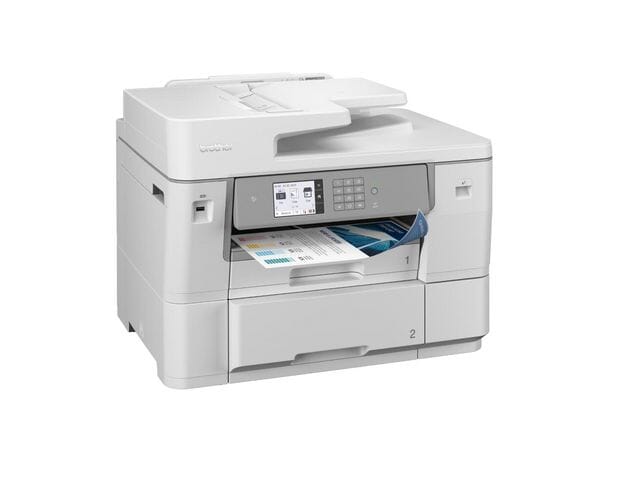 Brother MFCJ6959DW er en profesjonell multifunksjon farge blekkskriver for utskrift i opptil A3/langt format. Utformet for bedrifter som trenger en fleksibel skriver som kan skrive ut, kopiere, skanne og fakse med den ekstra fordelen av å skrive ut langt format med papirrull. Du kan enkelt skrive ut bannere, skilt, plakater, panoramabilder og salgsfremmende markedsmateriale i høy kvalitet, og deretter kutte til ønsket lengde med den automatiske kutteren. Skriveren har kablet og trådløs nettverkstilkobling, mobil tilkobling med appen Brother Mobile Connect og og Near-Field Communication (NFC) for sikker autentisering, mobil utskrift og skanning. Den første siden skrives ut på under 5 sekunder og utskriftshastigheten er på opptil 30 ipm i sort-hvitt og farger med MAXIDRIVE skrivehodeteknologi. Skriveren har 250 arks øvre papirmagasin, papirrull eller 500 A4-arks nedre papirmagasin, 50 arks tosidig A3 automatisk dokumentmater (ADF), automatisk tosidig A4/A3 utskrift, kopi, skann og faks og 8,8 cm farge berøringsskjerm. Sammen med lavt strømforbruk er denne skriveren ideell for butikker, travle kontorer og arbeidsgrupper som er ute etter et mer miljøvennlig utskriftsalternativ. Standard blekkpatroner LC427BK er på opptil 3000 sider i sort-hvitt og LC427C/M/Y på opptil 1500 sider i farger. Som tilbehør finnes XL høykapasitet blekkpatroner LC427BKXL for utskrift av opptil 6000 sider i sort-hvitt og LC427CXL/MXL/YXL for opptil 5000 sider i farger. Annet tilbehør: underskap med hjul, utvidet garanti og oppgraderinger. Skriveren er miljømerket nordiske Svanen og Blue Angel, har tre årsgaranti.