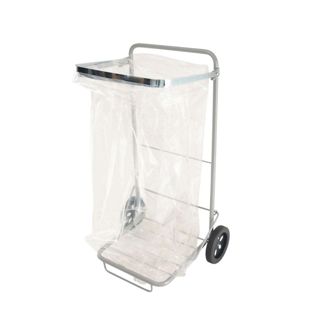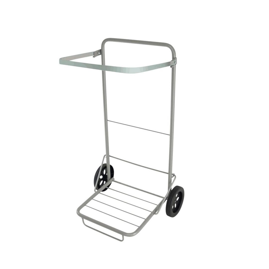 Sammenleggbart avfallsstativ med store lettrullende hjul i lakkert stål.