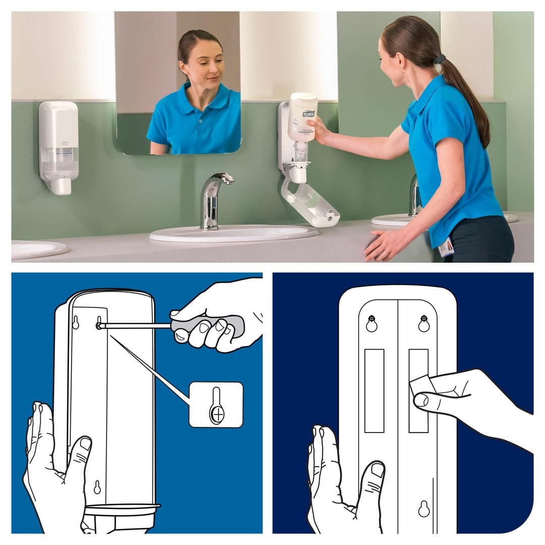 Tork håndhygiene dispenser med Elevation-design passer inn overalt og kan brukes med et stort utvalg av såper, desinfeksjonsmidler og kremer i forseglede flasker fra Tork.
